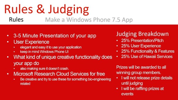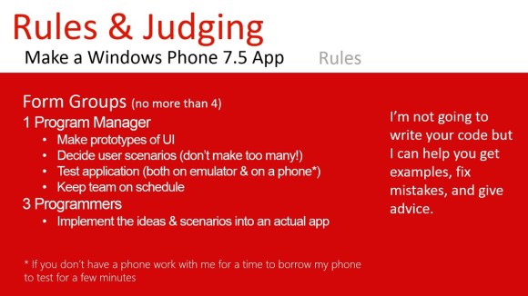 Thursday Nov 8th Austin from Windows Phone Division (Software Development Engineer in Test) will be at the ACM general meeting to give a short presentation as well as judge the progress made on apps. He will decide who is the winner and the winning group will receive prizes. THIS does not mean you have to have your app 100% finished but it rather is an opportunity to demonstrate what you have accomplished in the allotted time. Prizes are not going to be announced until then because the focus on this is to demonstrate your capabilities as students not to win prizes (plus don’t expect very expensive gifts for 4 winners at such a small event).